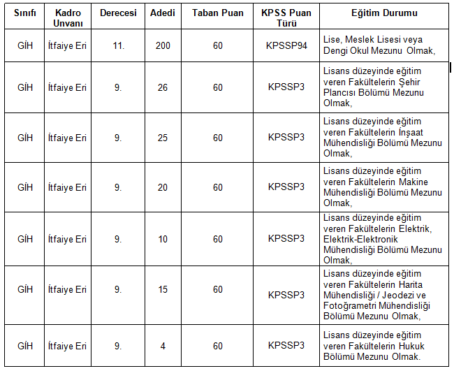 Istanbul Büyüksehir Belediye Baskanligi bünyesinde 657 Sayili Devlet Memurlari Kanununa tabi olarak istihdam edilmek üzere, 21.10.2006 tarih ve 26326 sayili Resmi Gazetede yayinlanan Belediye Itfaiye Yönetmeliginin 15, 16 ve 17. maddeleri ile 11.04.2007 tarih ve 26490 sayili Resmi Gazetede yayinlanan Belediye Itfaiye Yönetmeliginde Degisiklik Yapilmasina Dair Yönetmelikte belirtilen hükümler çerçevesinde Baskanligimizda münhal bulunan asagida sinifi, unvani, derecesi, âdeti, KPSS taban puani ve türü belirtilen Itfaiye Eri kadrolarina; Merkezi sinavdan (KPSS) komisyonca belirlenen asagidaki taban puani alip baskanligimiza müracaat eden adaylar arasindan, en yüksek puandan baslamak üzere ilan edilen kadro sayisinin 3 kati aday belirlenerek sözlü sinava çagirilacaktir.